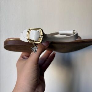 Chic Guess sandals with white straps. Tan footbed for a stylish look. Ideal for casual outings.