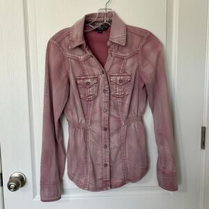 Guess Wms Small LS Distressed Snap Front Pink Shirt Jacket Cinch Waist