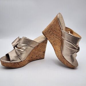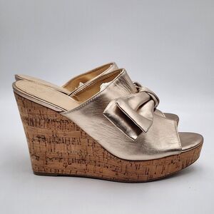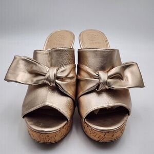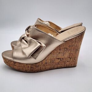 Guess Women Gold Hotlove Leather Open Toe Sandals Wedge Shoes Bow Size 9.5 READ