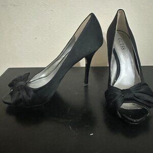 👠Guess Women’s Black Peep Toe Slip-On Silk Pumps with Bow – Size 8