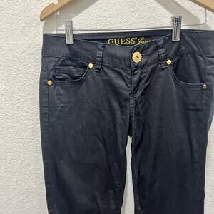 Elevate your everyday style with these classic GUESS Jeans black skinny jeans. Crafted for a sleek and flattering silhouette, these versatile black skinny jeans are a wardrobe essential. The rich black wash offers endless styling possibilities, making them suitable for dressing up or down. Designed with the iconic GUESS aesthetic, these jeans provide a comfortable yet contoured fit. The skinny leg design ensures a modern and streamlined look that pairs effortlessly with your favorite tops, sweaters, or jackets. Experience the quality and style that GUESS is known for with this timeless denim piece. This item is in pre-owned, very good condition, showing minimal signs of wear. Ready to be incorporated into your rotation, these GUESS black skinny jeans are a stylish and practical addition to any wardrobe. Add a touch of designer denim to your collection today.