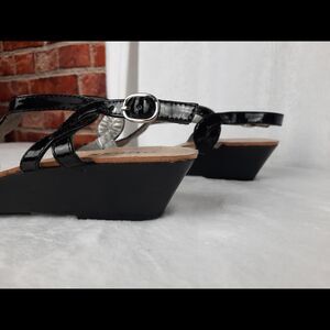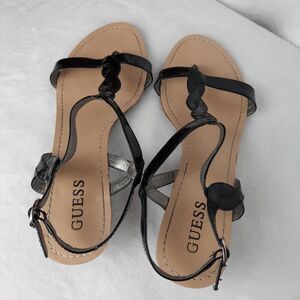 This is an absolutely adorable little pair of flat strappy sandals by Guess that are in like new condition. These sandals have an elegant strappy black patent leather design, smooth beige insole, and ankle buckle closure. They are a size 10M. I have included measurements in the pictures for a perfect fit. I do consider reasonable offers!! All items are shipped the same or the next business day!! Bundle two or more items and receive an automatic 15% discount and combined shipping at checkout!!