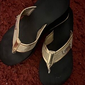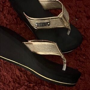 Stylish Guess sandals with a black base and gold straps. Perfect for any occasion. Size 6