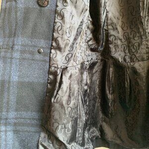 Gorgeous double breasted peacoat in a classic navy black plaid with ribbed knit collar with a feminine silhouette and military inspired shoulder straps. Love the detailed silver buttons and the collar detail. It's a really elegant coat with the way it is fitted or tailored. It is a quality coat in a wool blend with a dropped waist which is flirty and romantic. It also is lined with a black satin "G" print fabric. Love the vintage Y2K styling. Slant Pockets. Gently used condition but missing one button at bottom.