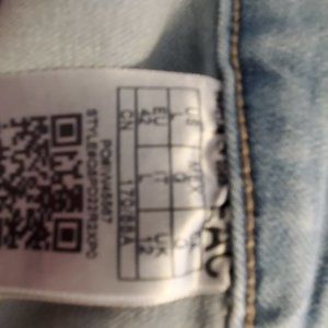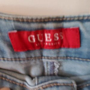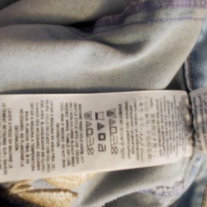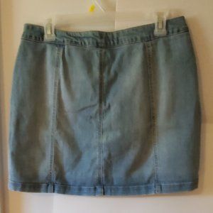 Very nice light wash blue denim mini skirt by Guess. This piece is so cute. It has an floral embroidered applique on each side of the front. It does button up and has some stretch. This is a bohemian style piece for people who love to wear color and style. It's a women's size L and has some stretch to it as well. This is a cotton/polyester blend with spandex. 16" across the front of the waist and 16" from waist to hem.