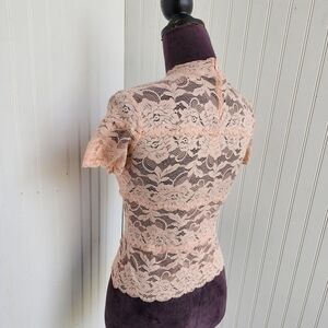 Guess Women's Blush Pink Lace Top Blouse Zip Back Short Sleeve Stretch XS Q27