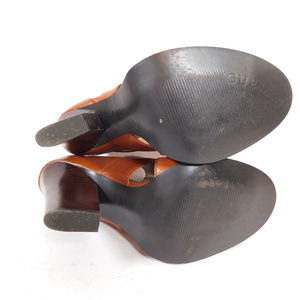 Size 9. Brown leather and manmade leather uppers, peeptoe, side buckles, zipper on back of heel. Tall stacked heel. Nice condition. One minor mark as noted. All shoes are inspected for defects/stains and any imperfections are photographed. Fast shipping! Check out our other great items in our closet -- create a bundle & save!