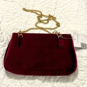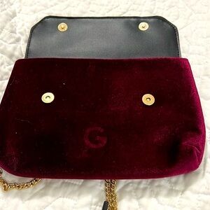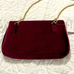 Guess velvet evening purse with gold chain straps. One compartment, Two metal front magnetic buttons. Burgandy, great for special occasion occasions. NWT