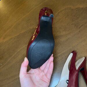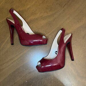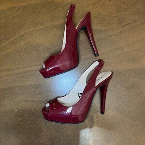 Burgundy patent leather Guess sling-back open-toe peep-toe pumps with 4-inch heel