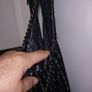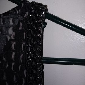 GUESS WOMEN'S "CHAINLINK" BLACK GRAY CHAIN PATTERN TANK TOP WITH HEAVYDUTY DOUBLE METALLIC COLORED CHAIN TRIM AROUND ARMHOLES AND SHEER BLACK HEM ACCENT PIECE WITH SPLIT SIDE HEM