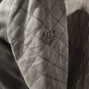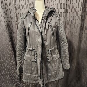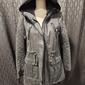 Chic charcoal utility jacket with hood. Features quilted sleeves and multiple pockets. Ideal for layering.