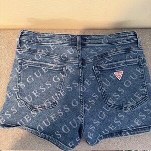 Stylish high-rise denim shorts featuring Guess's iconic all-over logo print. Crafted from a cotton-polyester blend for durability and comfort.