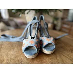 Guess Women's Halona Pumps in Denim Blue/Pink, size 8.5. These lace-up sandals feature an illustration pattern and an ultra-high wedge heel. Made of manmade material, they are designed for adult women. The brand is GUESS, and the style is a pump sandal. Perfect for adding a touch of flair and height to your outfit.