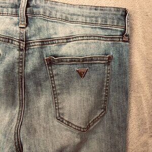 These Guess skinny jeans, expertly crafted from durable denim, showcase a stylish light wash and distressed hem. Comfortable and versatile, they are a fashionable choice for casual outings or relaxed gatherings, embodying a contemporary look while ensuring an excellent fit. With an iconic Guess design, these jeans seamlessly combine functionality and elegance.