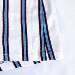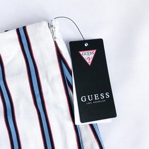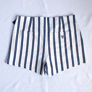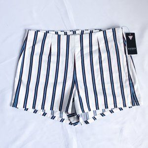 Guess Women's Kairi Metallic Striped Shorts. Size 8. Colors: White, Blue, Metallic Red. These lightweight, high-rise shorts feature two back pockets, a side zipper closure, and vertical stripes with metallic details. Material: 97% cotton, 2% spandex, 1% metallic threading. Hand wash and dry flat. New with tag. Colors may vary by screen.