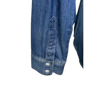 Guess Womens Long Sleeve Denim Shirt Gold Glitter Detail on front and sleeves.. Two front breast pockets. 100% cotton. Size Medium. Measurements taken flat:
