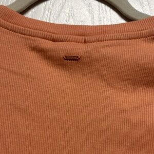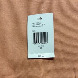 Stylish Guess crop top in a soft peach color. Features ruched sides with tie details. Perfect for casual wear.