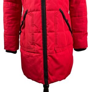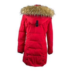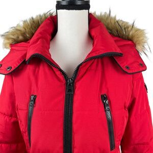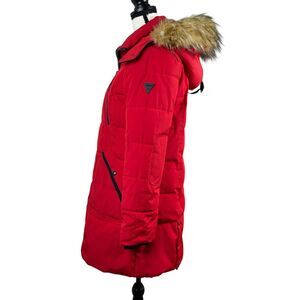 Guess Women's Puffer Jacket Size Medium Red Black Faux Fur Full Zip Winter Coat