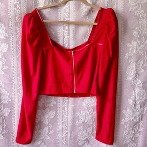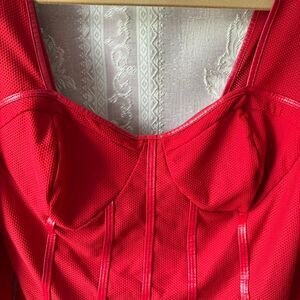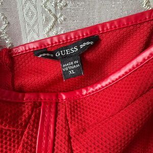 Beautiful Guess red long sleeve corset bustier top. Faux leather piping and shirred shoulders. Bust is lined. Zips in back. Very nice material and has some stretch. Looks brand new!