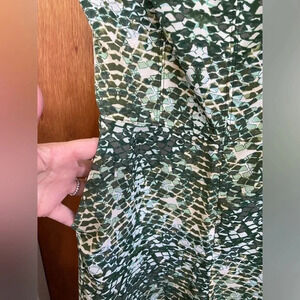 Very pretty GUESS sleeveless tank style Culottes jumpsuit romper. Very flattering green animal snake print. Fitted bodice with zipper back and cut out for extra style on back. Adjustable straps. Pockets. Wide leg styling 42” long other measurements in photos. Sz 2 perfect preowned condition. No fabric content tag but it feels like a soft polyester or silk blend.