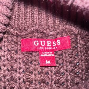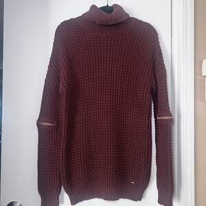 Pre-owned Guess chunky knit turtleneck sweater in brown, size M. Features gold-tone zipper accents on sleeves and ribbed hem/cuffs. Approx. measurements: 20” pit to pit, 27.5” length. Excellent condition.