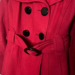 Elegant red trench coat with double-breasted design. Features bold buttons and a stylish belt.