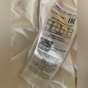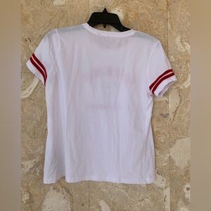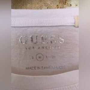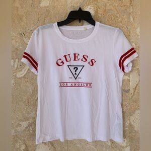 White t-shirt with red Guess logo and stripes. Features 'Los Angeles' text.