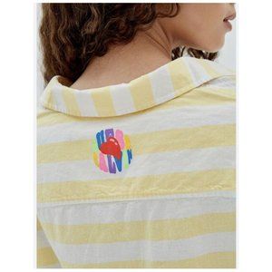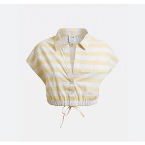 A striped, woven top featuring a folded collar, V-neckline, button placket, drawstring waist, short dolman sleeves and a back logo.