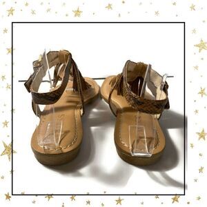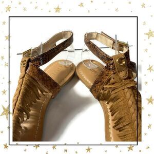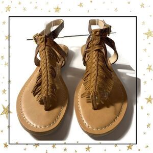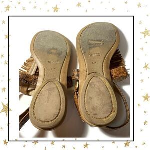 Cute! pair of Guess women's thong sandals with decorative fringe. Ankle strap, buckle closure. Signature gold "G".