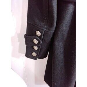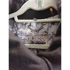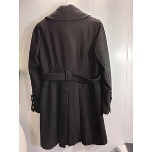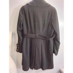 This Guess Wool Blend Pea Coat in size XL is a stylish and classic outerwear option for women. Made with a solid black wool blend outer shell, this mid-length coat features a double-breasted closure, belted silhouette, and long sleeves. The fully lined jacket also includes side pockets, making it practical for various occasions like travel, casual, workwear, or business attire. With designer accents like a wide collar, belted waist, and button closures, this coat is perfect for the winter and fall seasons, adding a touch of sophistication to any city-inspired ensemble.