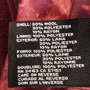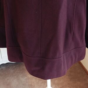 Deep cabernet enriches this wool moto/ pea coat inspired jacket. Wear it all zipped up or create a collar by unzipping. Signature zip pulls and lining. Size XL measures 46 at chest, 52 at bottom hem. 30 long from shoulder to hem. Sleeves 25. Such a beautiful color. Warm and cozy and great looking. Excellent condition.