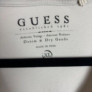 This is an extra large Guess shirt. This shirt is in a light gray, silvery color, and it bears an interesting graphic print across the entire front, featuring a gradient of colors on a triangle emblem, from red to blue on the bottom. This shirt has some text over the triangle graphic, as well as some other white designs, that are cracking and a bit faded over time, but still visible and impactful on the presentation! This shirt has a rounded v neck shape and short sleeves, and is a soft, comfortable, and durable 100% cotton material, woven perfectly to ensure durability and all-day viability! Great used condition, bears minor staining on the front; shirt is machine washable. See pictures!
