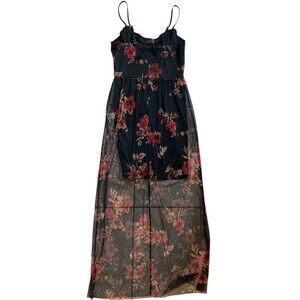 Guess XS Black Floral Mesh Maxi Dress Sheer Overlay Spaghetti Strap NWT