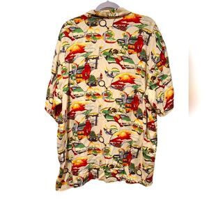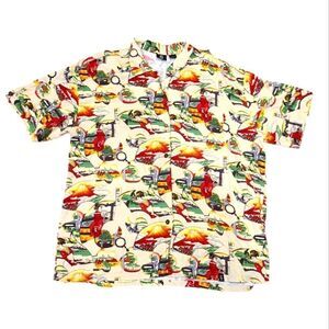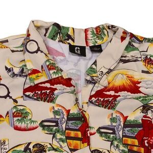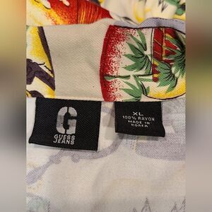 Vintage Guess Y2K Retro Allover Giesha Print Button Down Short Sleeve, Brushed Cotton | XL | EUC | 1-pocket on front | Extra Button | Measurements Laying Flat and Unstretched: Pit to pit 24" | Length 30" | Sleeve Length 9.5" | Off White with Red, Green, Yellow and Gray Printed Design