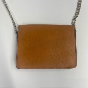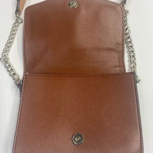 This Guess crossbody bag showcases a sophisticated blend of brown and blue hues, enhanced by striking metallic accents. Its structured design and envelope-style flap closure offer both style and practicality, making it an ideal accessory for any occasion. The smooth finish and chain strap add a touch of elegance to this versatile piece.
