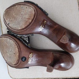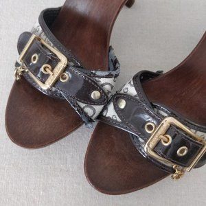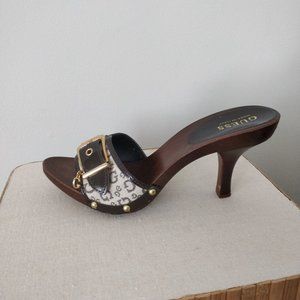 Guess brand faux wood and leather mules with approx. 3 inch heels. I typically wear a 5.5-6 US and these fit me perfectly.
