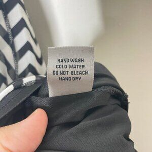 Bottom is a semi-sheer black and white chevron print in a wrap high low style and is well lined with a short black skirt lining