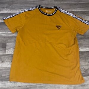 This vibrant yellow tee from Guess features a classic crew neck and short sleeves, perfect for a casual day out. The contrasting black trim around the neckline adds a touch of style, while the distinctive shoulder stripe enhances its sporty appeal. A small triangular logo on the chest completes the look, making it a standout piece in your wardrobe.