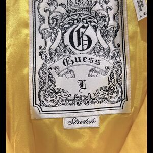 Gorgeous Guess Zip up bomber jacket. It’s lined on the inside and has a yellow button on top. Jacket is machine washable and is in excellent condition but has a few minor signs of wear scratches from wear. See pictures.