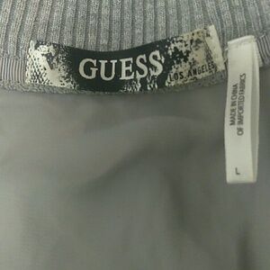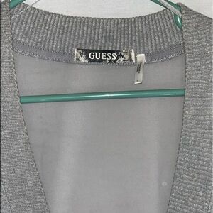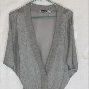 Grey cardigan with a cool bat wing. Has a classic “college” like, “lettermen” type of detail around the borders. Has sheer back. 3 invisible, large snaps as a closure.