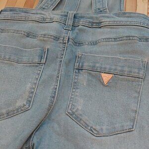 Guess bib overall distressed jeans , no size tag, fit size S. some pilling on inside. see measurements for better fit, waist is 13.5", inseam is 25.5"