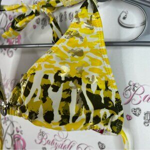 Chic bikini top with vibrant yellow and black pattern. Halter neck style. M.