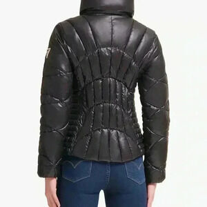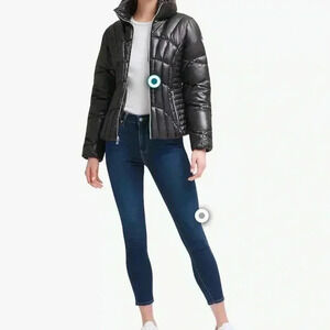 Guess black puffer coat size large. In excellent condition! This coat is a very cozy and awesome coat for the winter. It’s tapered into the waist and is very flattering! It has two front pockets with zippers and has a zipper closure. It also can zip around the neck area for those extra chilly days!