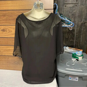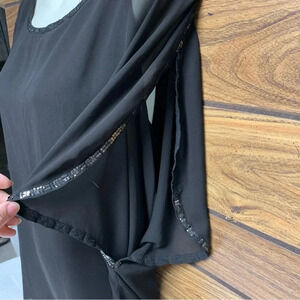 Pretty faux 2 piece top with black tank underneath. Sequins on the collar and sides of the split sleeves . Small guess on the left hip.