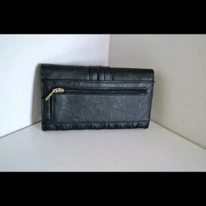 NWOT Guess wallet. Measures 7 1/2" x 4 1/2". Faux leather. Black. Silver tone hardware. 14 card slots total. 1 ID card. 4 bill folds. Zip coin pocket on back. Large Guess logo on front. In excellent condition!