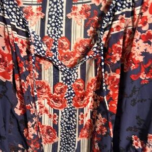 This stylish women's top features a vibrant floral design in navy and red. Perfect for any occasion, it offers a comfortable fit with a touch of elegance. This blouse top is lightweight and in great preowned condition. Bohemian summer festival