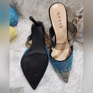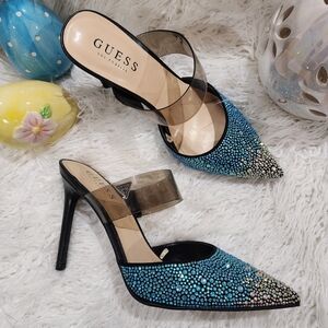 Stunning blue heels with sparkling embellishments. Features clear straps for a modern look. Perfect for a night out.