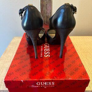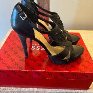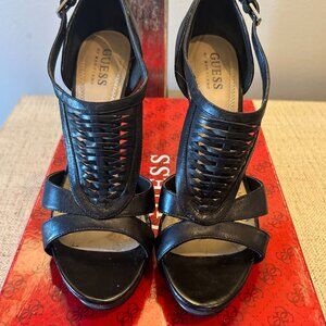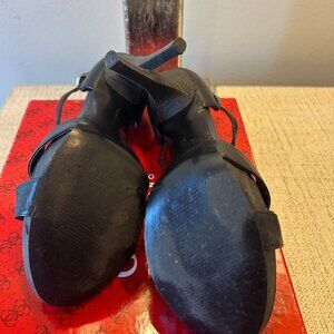 The Karaoke Heel. Size 8.5 M. Black leather. Woven t-strap. About 4 3/4" Heel. 1 inch platform. Wooden heel. Adjustable Side strap.