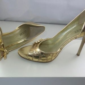 These gold snakeskin looking leather stilettos with a 4 inch heel feature a cute bow with tiny guess charms attached. Only worn ONCE and in excellent condition!