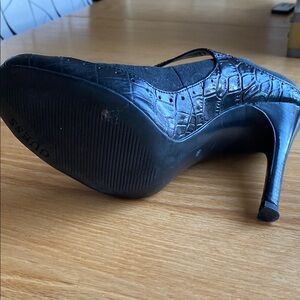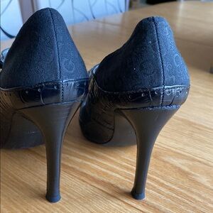 Guess by Marciano “Mary Jane “ style stilettos.4 in heels. Logo embossed fabric with leather trim and round toes. No box